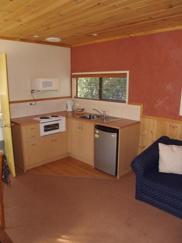 All holiday cabins at Launceston Holiday Park Legana Tasmania have an en suite bathroom, fully equipped kitchen, TV and electric heating. Each cabin also has a covered outdoor area.