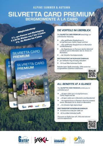 The Silvretta Card offers free use of cable cars in the region, of the buses from Landeck to Bielerhöhe, and free access to the indoor and outdoor pools and to the lake in the Paznaun Valley.