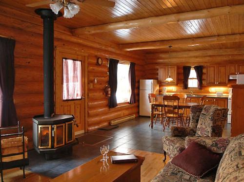 This two-bedroom log cabin features a patio, fireplace and fully equipped kitchen.