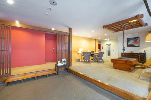 This Japanese-styled room fits up to 2 people. There's a standing shower with basic amenities, washlet, TV, kitchen and sitting table.