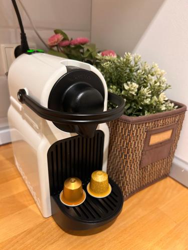 This apartment has a kitchenette with a dishwasher, a toaster and a coffee machine.